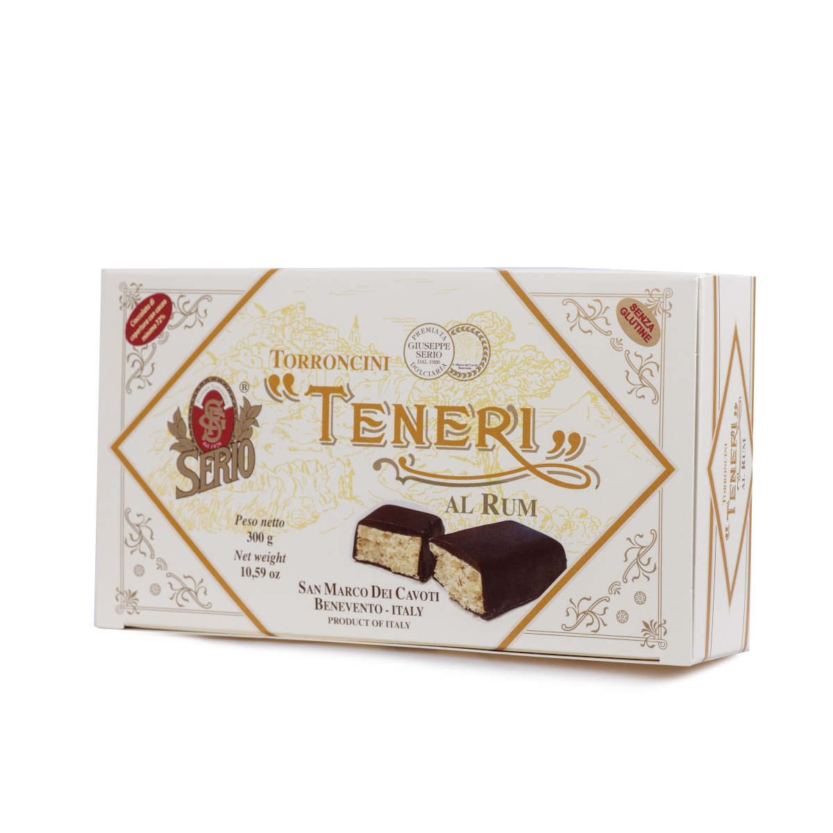 INGREDIENTI: Zucchero, Nocciole, Miele, Pasta di cacao, Burro di cacao, Sciroppo di glucosio, Latte in polvere, Albume d'uovo, Olio di Arachidi, Siero di latte in polvere, Emulsionante: lecitina di soia, Aroma naturale di vaniglia, Aromi.