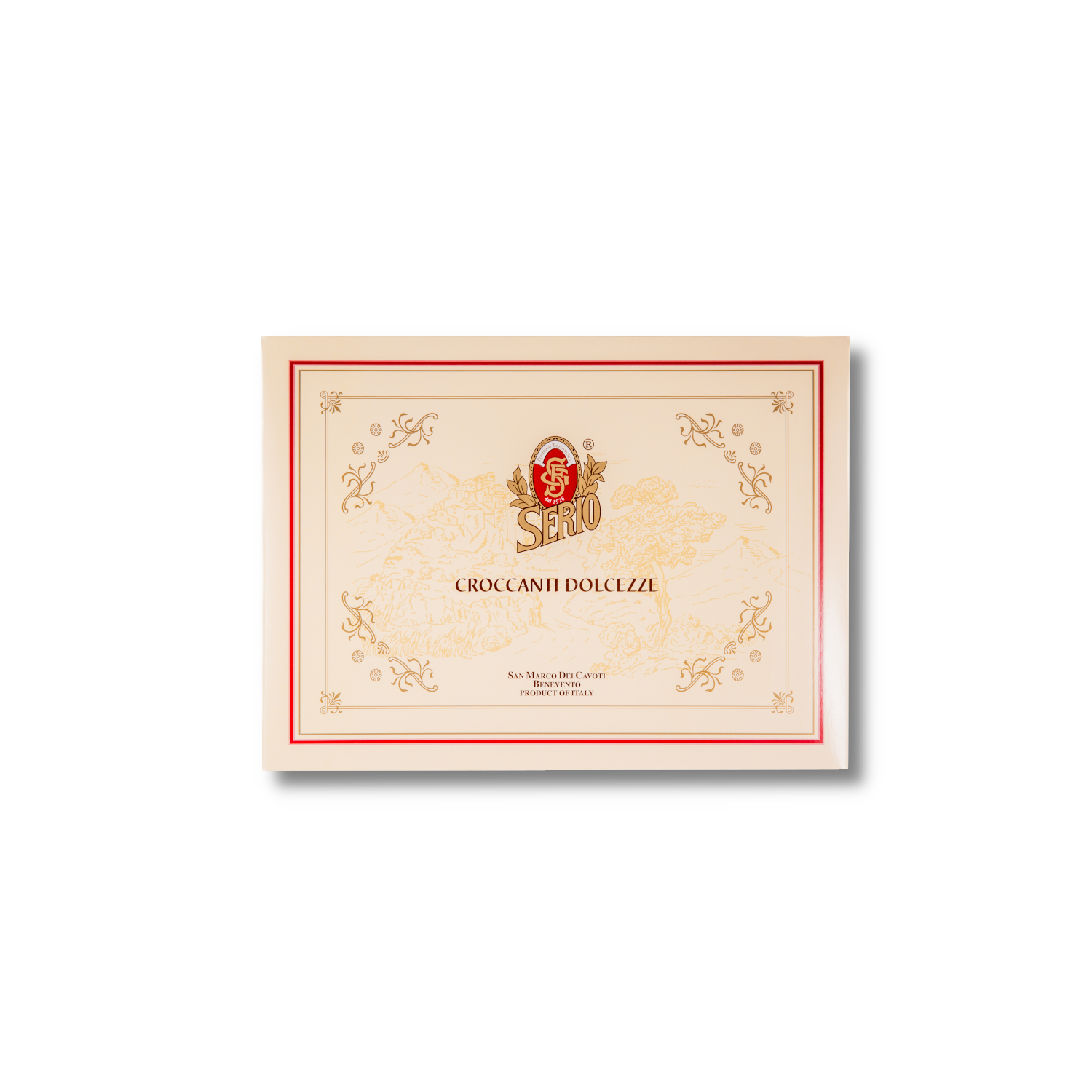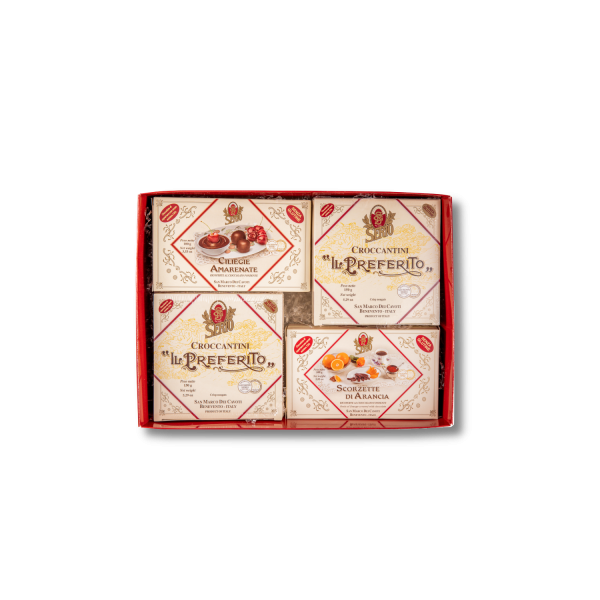 La confezione regalo comprende: 2 x Croccantino Preferito 150 gr 1 x Scorzette di arancia ricoperte al cioccolato fondente 100gr 1 x Spicchi di Pere ricoperte al cioccolato fondente 100gr
